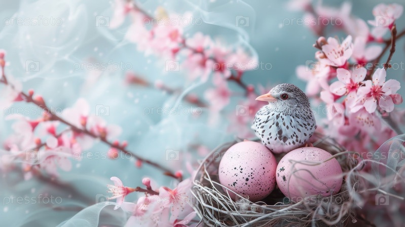 Пасхальная корзина с цветными яйцами на светлом фоне
