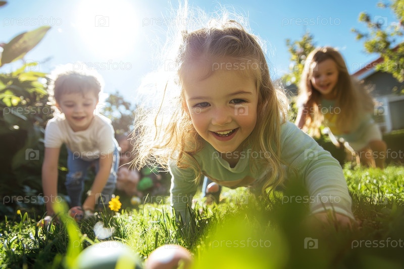 Дети участвуют в охоте на пасхальные яйца в солнечном саду