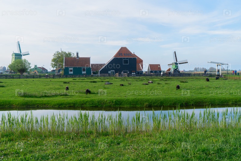 Деревенский голландский пейзаж с ветряными мельницами в тумане, Нидерланды