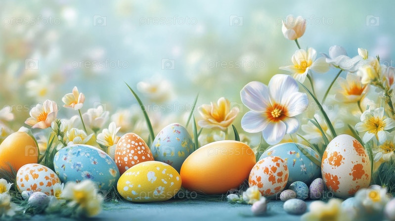 Деликатное весеннее яйцо, окруженное красивым цветочным расположением, которое вызывает чувство спокойствия и элегантности