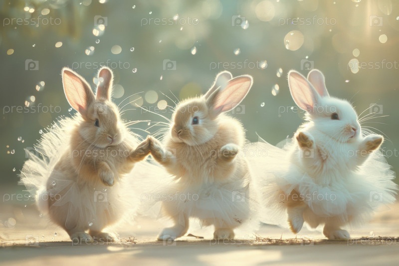 Улыбающиеся пушистые кролики на розовой пасхальной вечеринке танцуют вместе,
