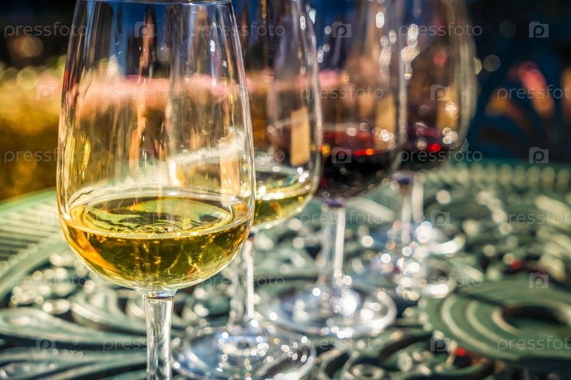 Тестирование портовых вин, бокалы с напитком - белый и красный