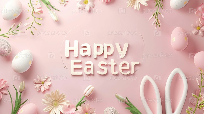 Модный пасхальный дизайн с типографией, кроликами, цветами, яйцами, ушами кролика, в пастельных тонах