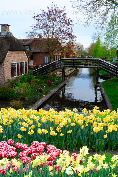Голландская деревня традиционная страна небольшой старый город Гийтхорн с каналами и мостами, Нидерланды пейзаж