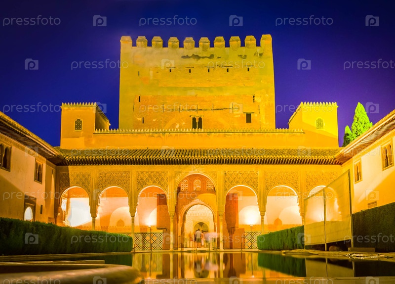 Patio de los Arrayanes (Двор Мирты) в Ла-Альгамбре ночью, Гранада, Испания