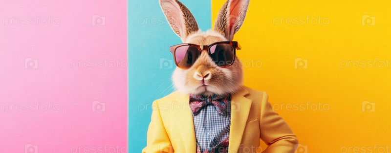 Стильный кролик, уверенно одетый в красочную одежду и шикарные солнцезащитные очки. модный зайчик, одетый в яркую одежду, дополненную модными очками на живом фоне