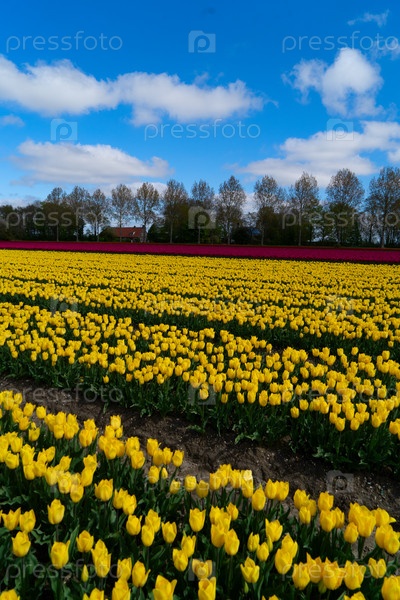 Голландские темно-розовые поля тюльпанов в солнечный день