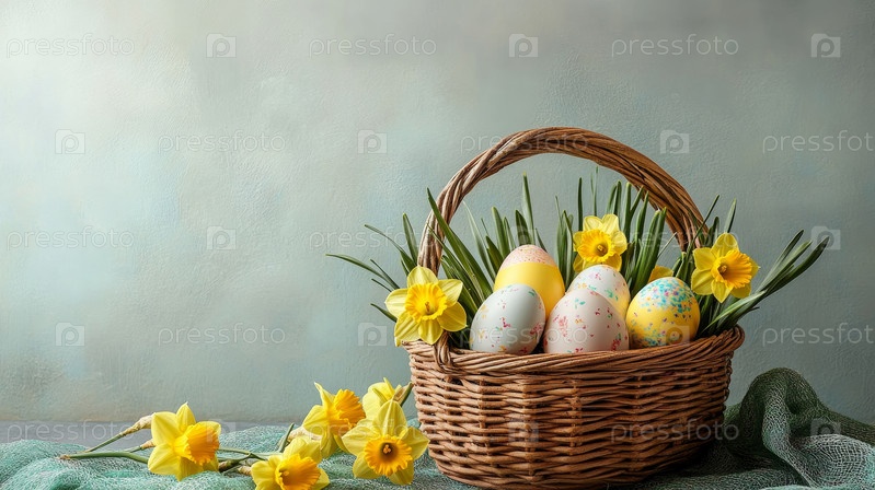 Корзина с пасхальными яйцами и цветами нарцисс,
