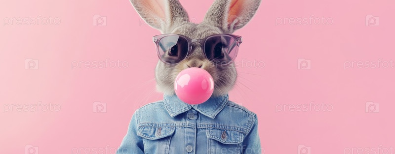 Стильный кролик в джинсовой рубашке и солнцезащитных очках, дующий розовый пузырь из жвачки, копируйте пространство