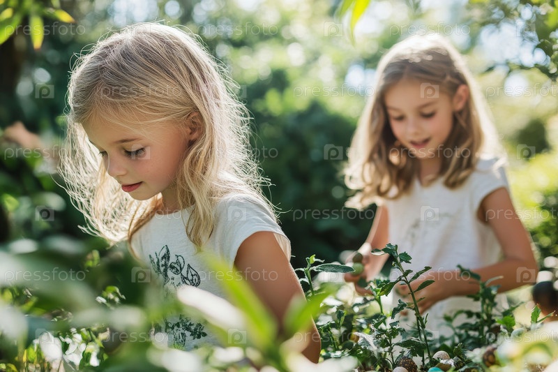 Дети участвуют в охоте на пасхальные яйца в солнечном саду