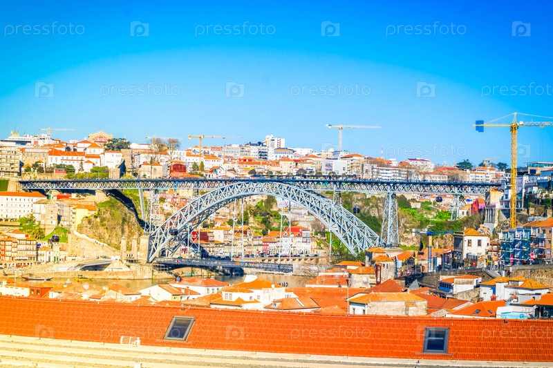 Живописный, красочный вид на старый город Порто над крышами винных погребов, Португалия с мостом Понте Дом Луис через реку Дуро