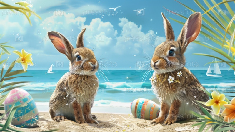 Два милых пасхальных кролика в солнцезащитных очках на отдыхе у пляжного побережья