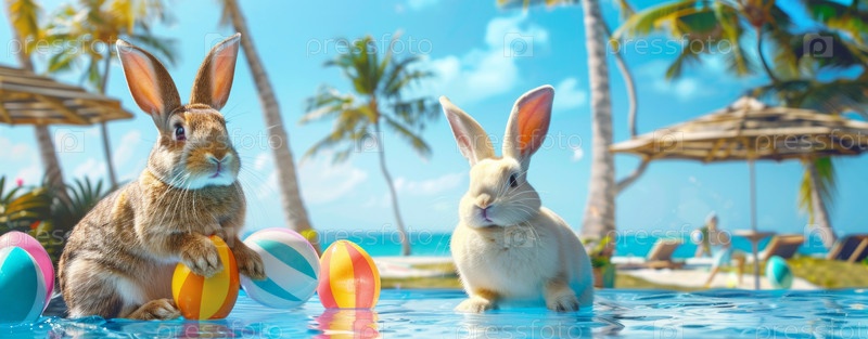 Два милых пасхальных кролика в отпуске у бассейна, пальмы на заднем плане