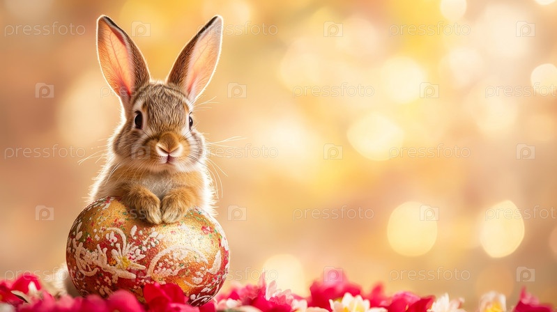 Пасхальный пейзаж, кролики с красочными яйцами и ромашками на лугу под прекрасным небом