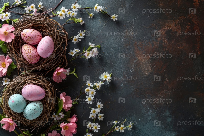 Красочные пасхальные яйца в гнезде и весенние цветы на сером столе