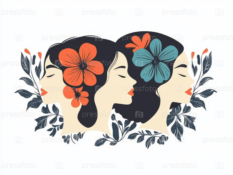 Линия женщин в профиле с определенными выражениями лица и излучающими полосами, винтажная палитра, передающая устойчивость поколений к раковым клеткам, визуальный