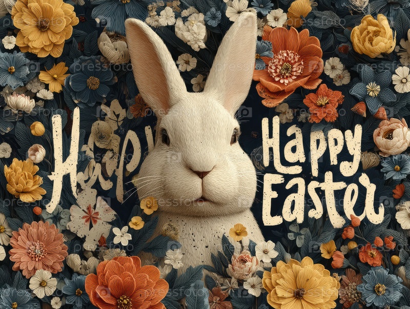 Винтажный пасхальный кролик, расположенный среди цветов, пастельный букет пионки, гортензии, розы, текстурированного гравированного стиля, теплая сепия-палитра, счастливое Пасхальное поздравление