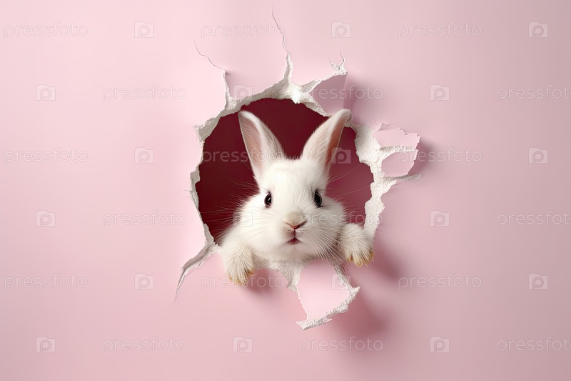 Милый счастливый пушистый белый пасхальный кролик заглядывает из дыры в светло-розовой стене, зайчик выпрыгивает из разорванного отверстия