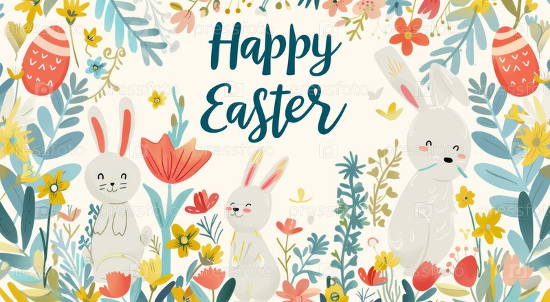 Модный пасхальный дизайн с типографией, кроликами, цветами, яйцами, ушами кролика, в пастельных тонах
