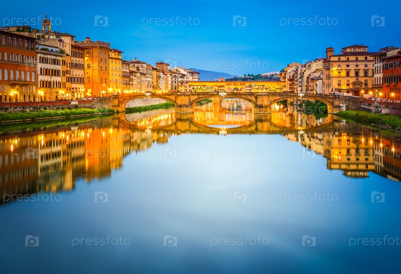 Мост Понте Санта-Тринита через реку Арно ночью, Флоренция, Италия
