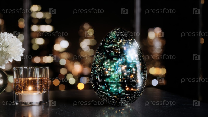Светящиеся раковые клетки внутри схем яйца на отражающем пьедестале, окруженные кристаллическим скоплением, пульсирующими люминесцентными венами и голографическими схемами