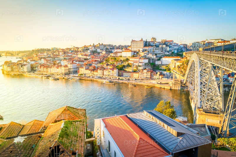 Живописный, красочный вид на старый город Порто при закате солнца, Португалия с мостом Понте Дом Луис через реку Дуро
