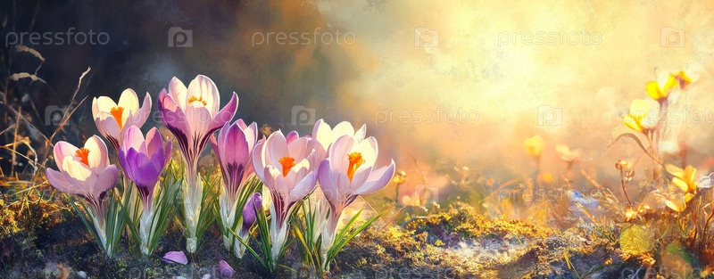 Росовые крокусы на золотистом лугу восхода солнца, мягкий солнечный свет фильтрующийся через пастельные лепестки, тонкие ярко выраженные боке сверкающие росы, перспективы вблизи