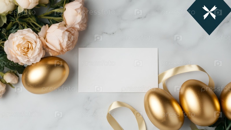Элегантный пасхальный макет с пустой пригласительной карточкой, размещенной на мраморном фоне и украшенной золотым листом пасхальных яиц