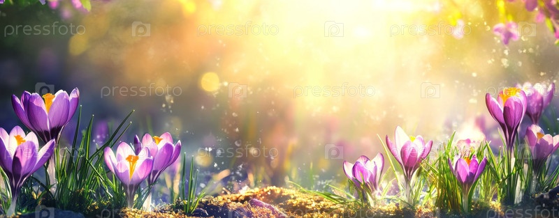 Росовые крокусы на золотистом лугу восхода солнца, мягкий солнечный свет фильтрующийся через пастельные лепестки, тонкие ярко выраженные боке сверкающие росы, перспективы вблизи