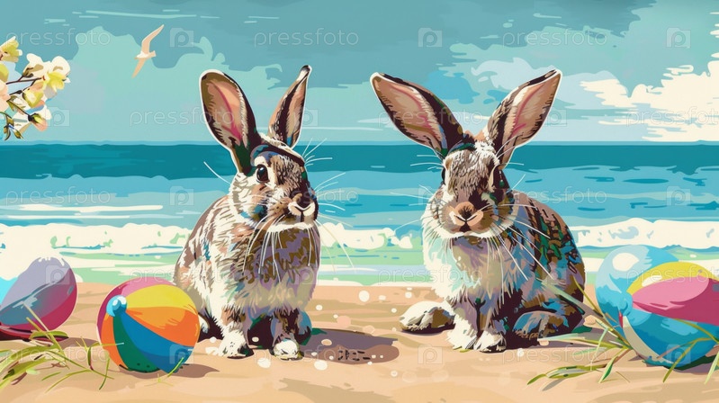 Два милых пасхальных кролика в солнцезащитных очках на отдыхе у пляжного побережья