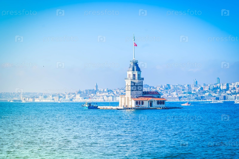 Горизонт Стамбула и водного пути Босфора с Башни Девы (Kiz Kulesi) в Истанбуле, Турция
