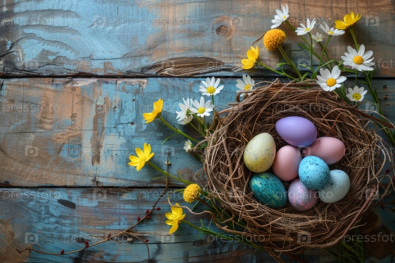 Красочные пасхальные яйца в гнезде и весенние цветы на сером столе верхний вид