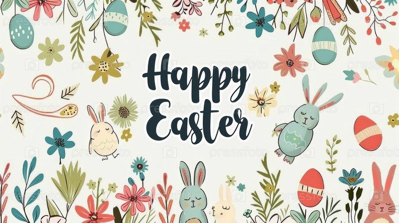 Модный пасхальный дизайн с типографией, кроликами, цветами, яйцами, ушами кролика в пастельных тонах
