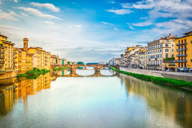 Старый город с мостом Санта-Тринита отражается в воде реки Арно, Флоренция, Италия