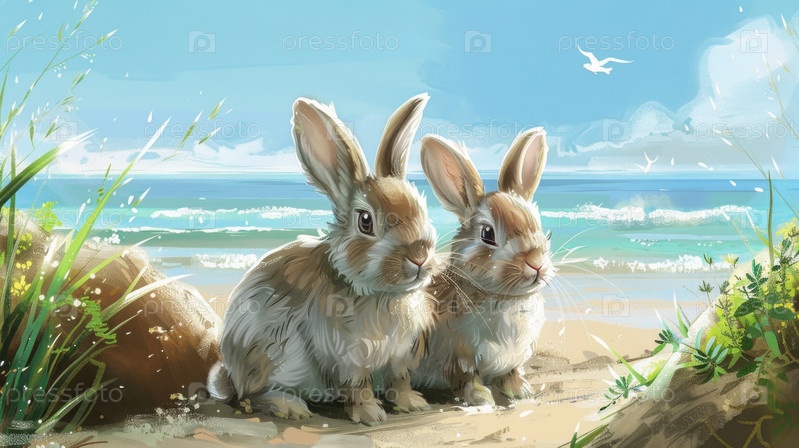 Два милых пасхальных кролика в отпуске у пляжного побережья