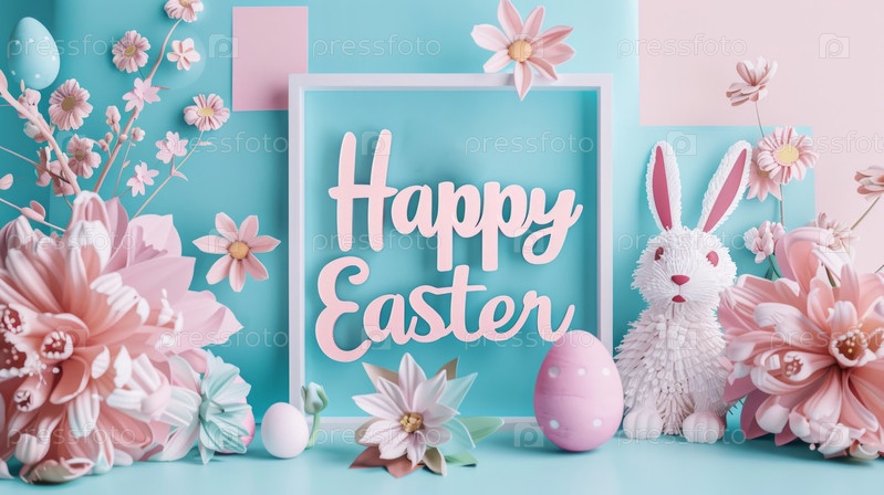 Модный пасхальный дизайн с типографией, кроликами, цветами, яйцами, ушами кролика, в пастельных тонах