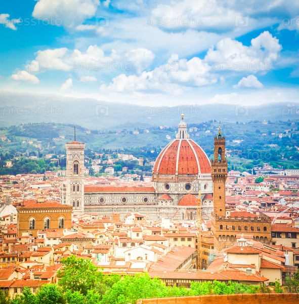 Городской пейзаж с соборной церковью Санта-Мария-дель-Фиоре над городом, Флоренция, Италия