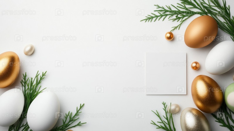 Минималистский пасхальный макет с белыми и золотыми яйцами, свежей зеленой травой и пустой карточкой в центре