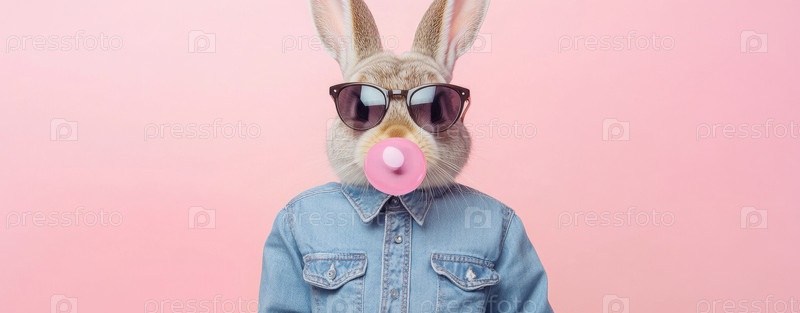 Стильный кролик в джинсовой рубашке и солнцезащитных очках, дующий розовый пузырь из жвачки, копируйте пространство
