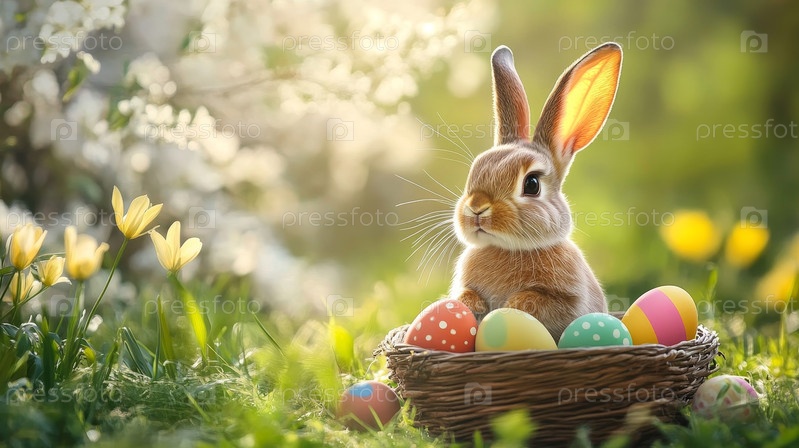 Милый пасхальный кролик с красочными яйцами в гнезде на весеннем фоне природы