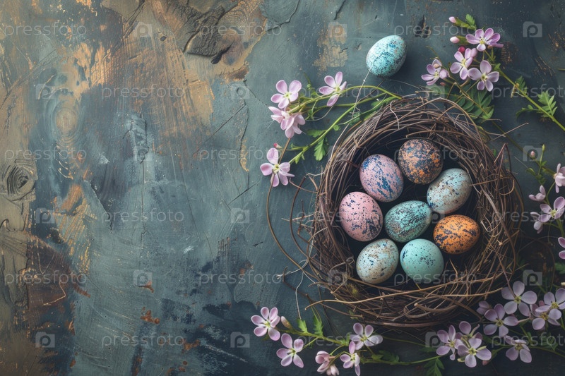 Красочные пасхальные яйца в гнезде и весенние цветы на сером столе верхний вид