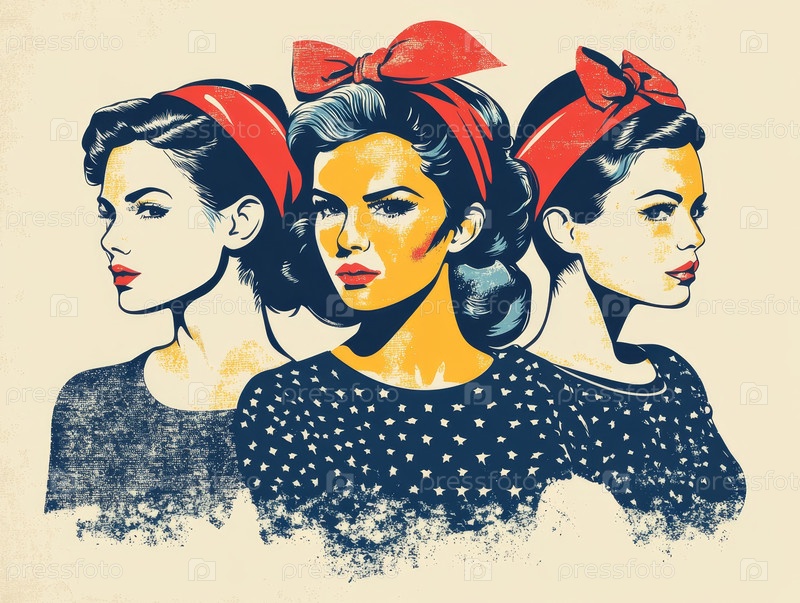 Три женщины в ретро одежде позируют как хор, мотивы звезд и смелые цвета составляют призыв к действию против раковых клеток, подходящий для повышения осведомленности, скрининга