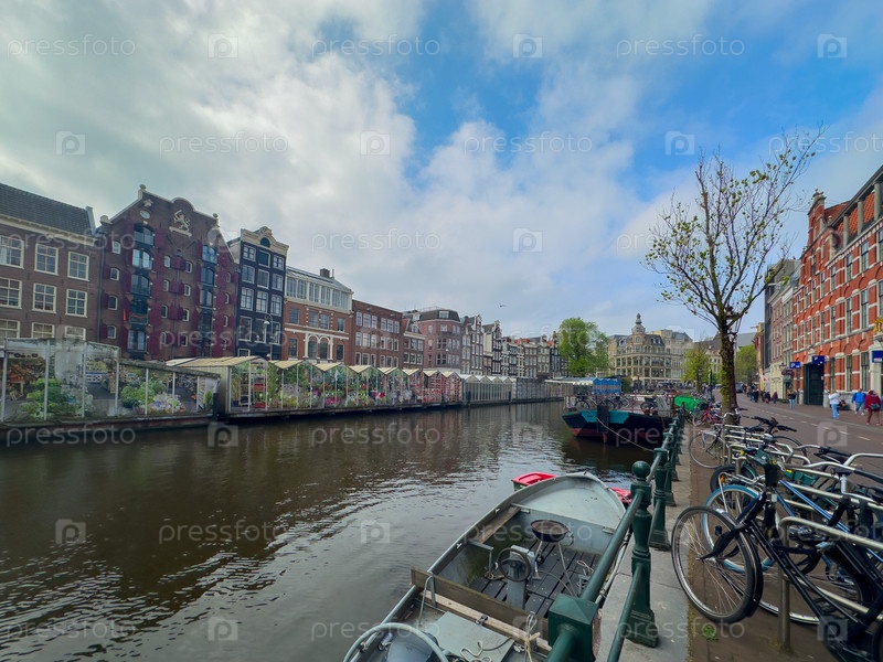 Фасады старых исторических домов и деревьев над водой канала, Амстердам, Нидерланды