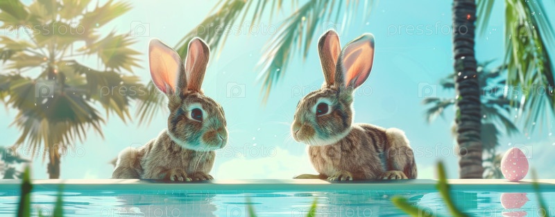 Два милых пасхальных кролика в отпуске у бассейна, пальмы на заднем плане