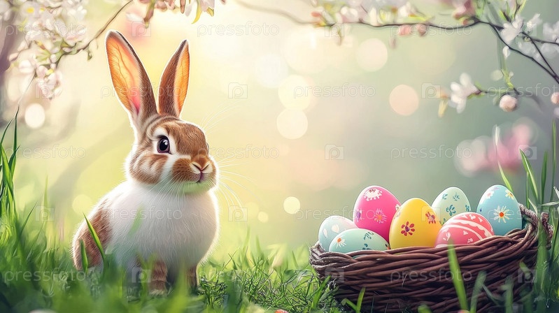 Милый пасхальный кролик с красочными яйцами в гнезде на весеннем фоне природы