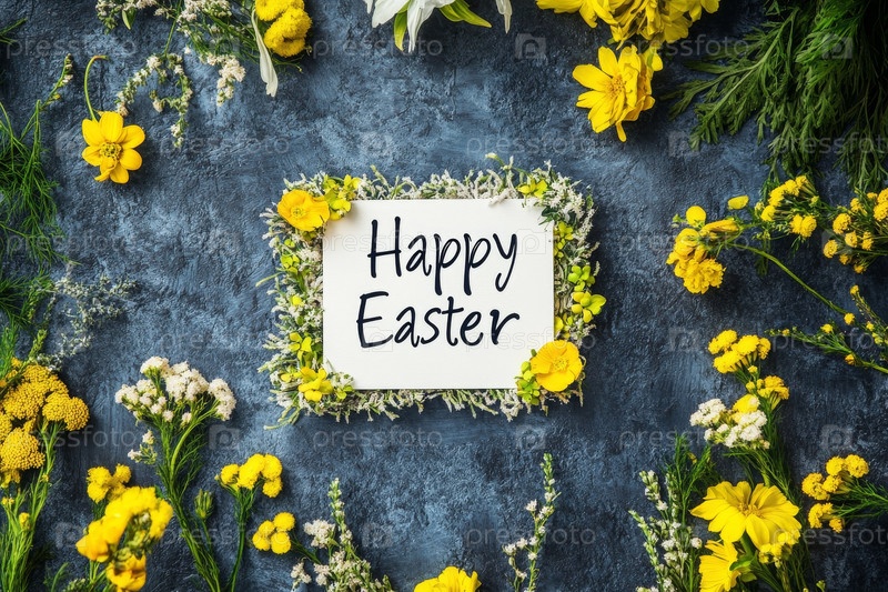 Рукописная открытка "Счастливой Пасхи" в окружении цветочных украшений, концепция пасхальных поздравлений