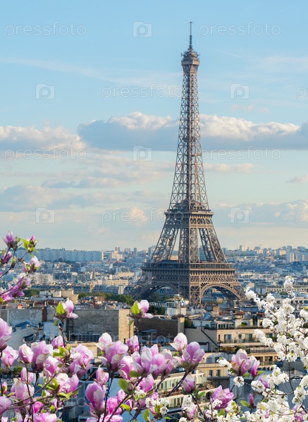 Знаменитая достопримечательность Эйфелевой башни и старые парижские крыши с цветами, Париж Франция