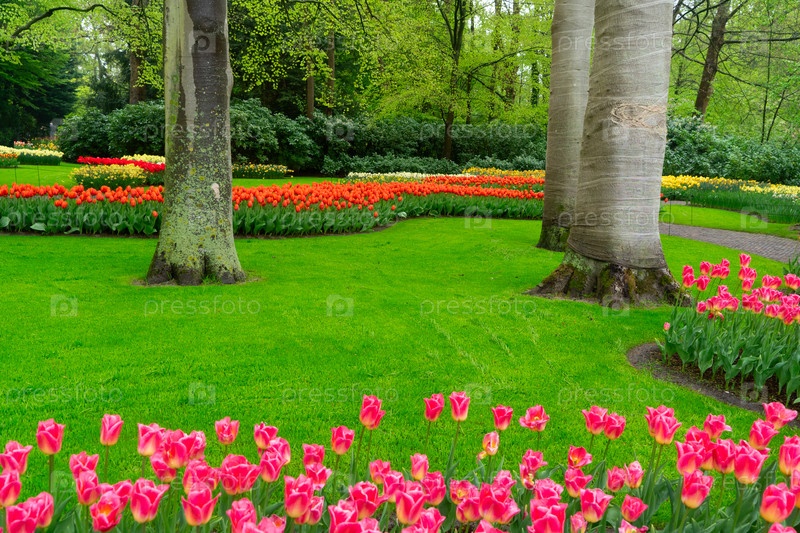 Красочный путь в саду тюльпанов, демонстрирующий яркие цветы в пышной обстановке, приглашает посетителей исследовать
