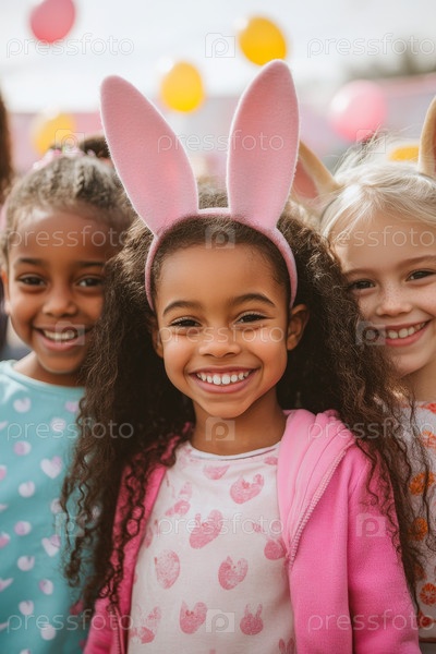 Пять радостных и веселых девочек в красочных кроличьих ушах счастливо празднуют Пасху в яркой атмосфере на открытом воздухе