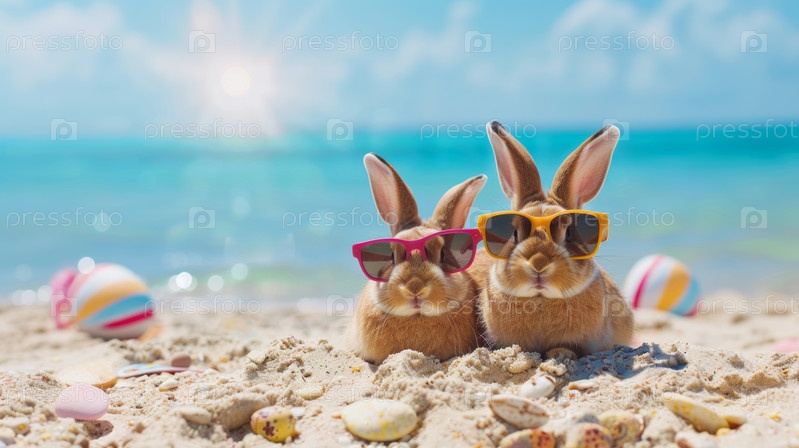 Два милых пасхальных кролика в солнцезащитных очках на отдыхе у пляжного побережья